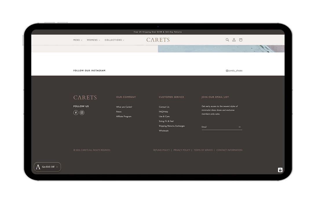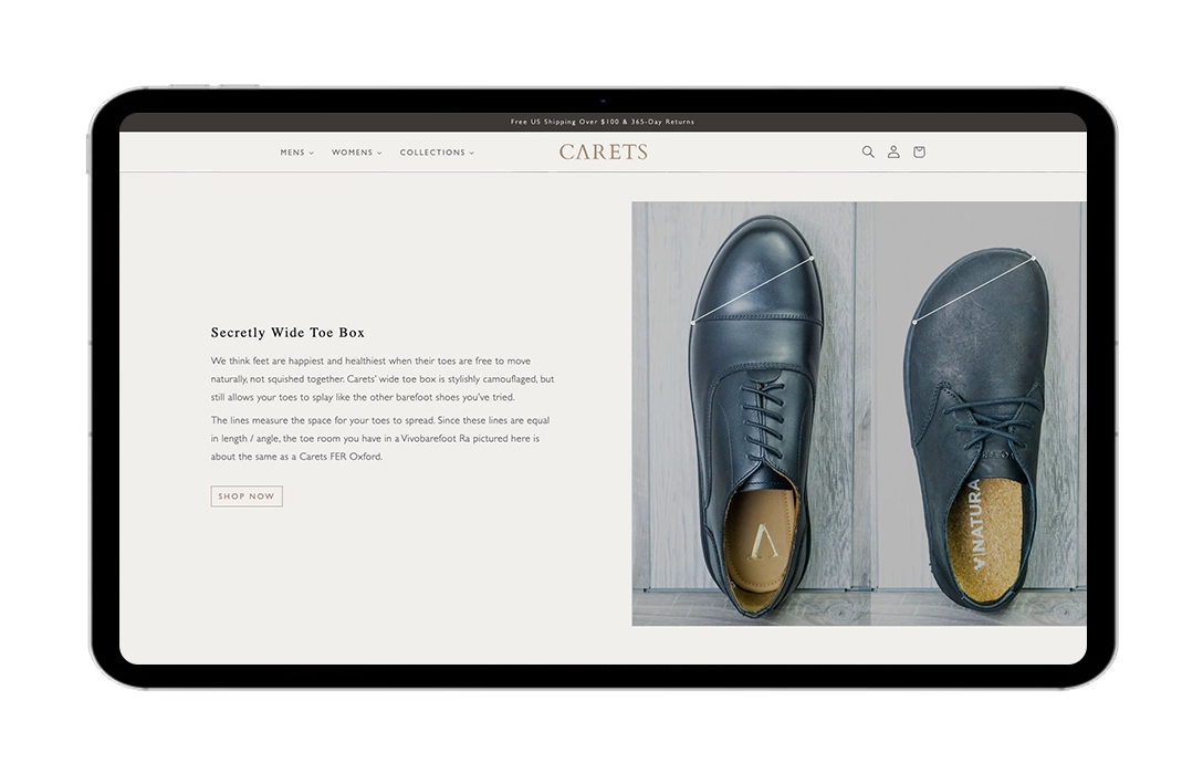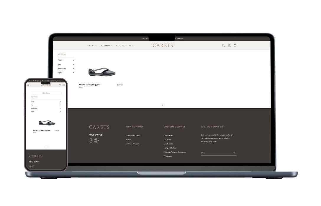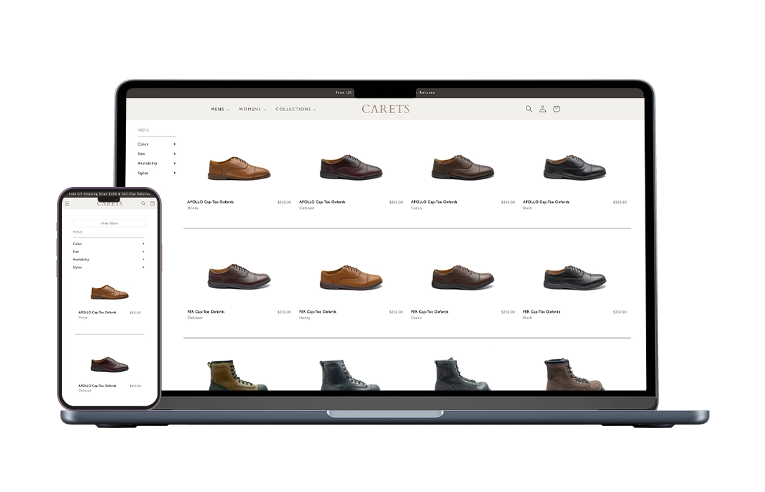 Carets, a premium men's footwear brand, required technical and user experience assistance to coincide with the sophistication of their collection. The website had long-standing frontend issues affecting product filtering, inconsistent UI elements across pages, and ongoing performance lags that impacted the shopping experience. Their Shopify setup required specialized intervention to meet premium usability standards without a full redesign.